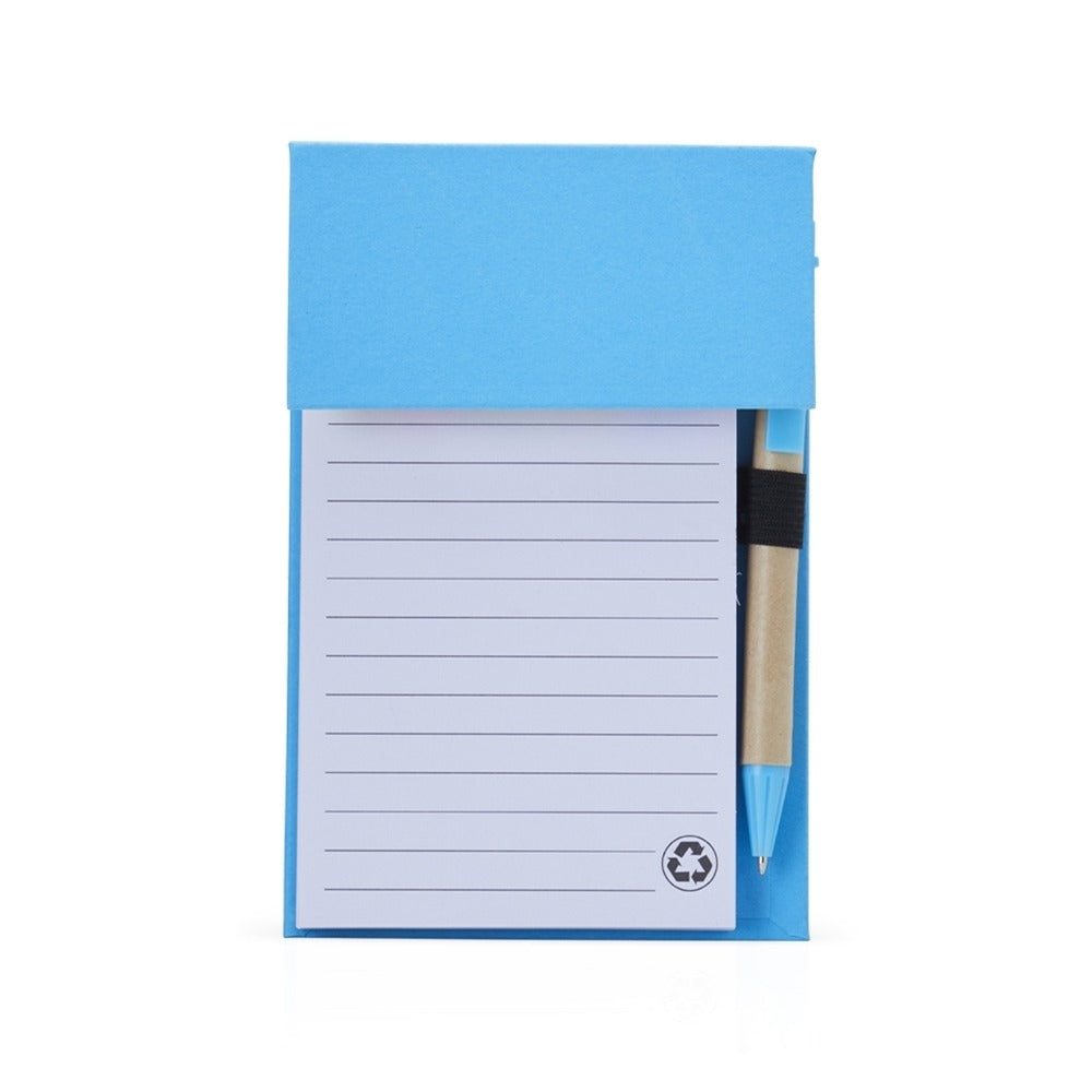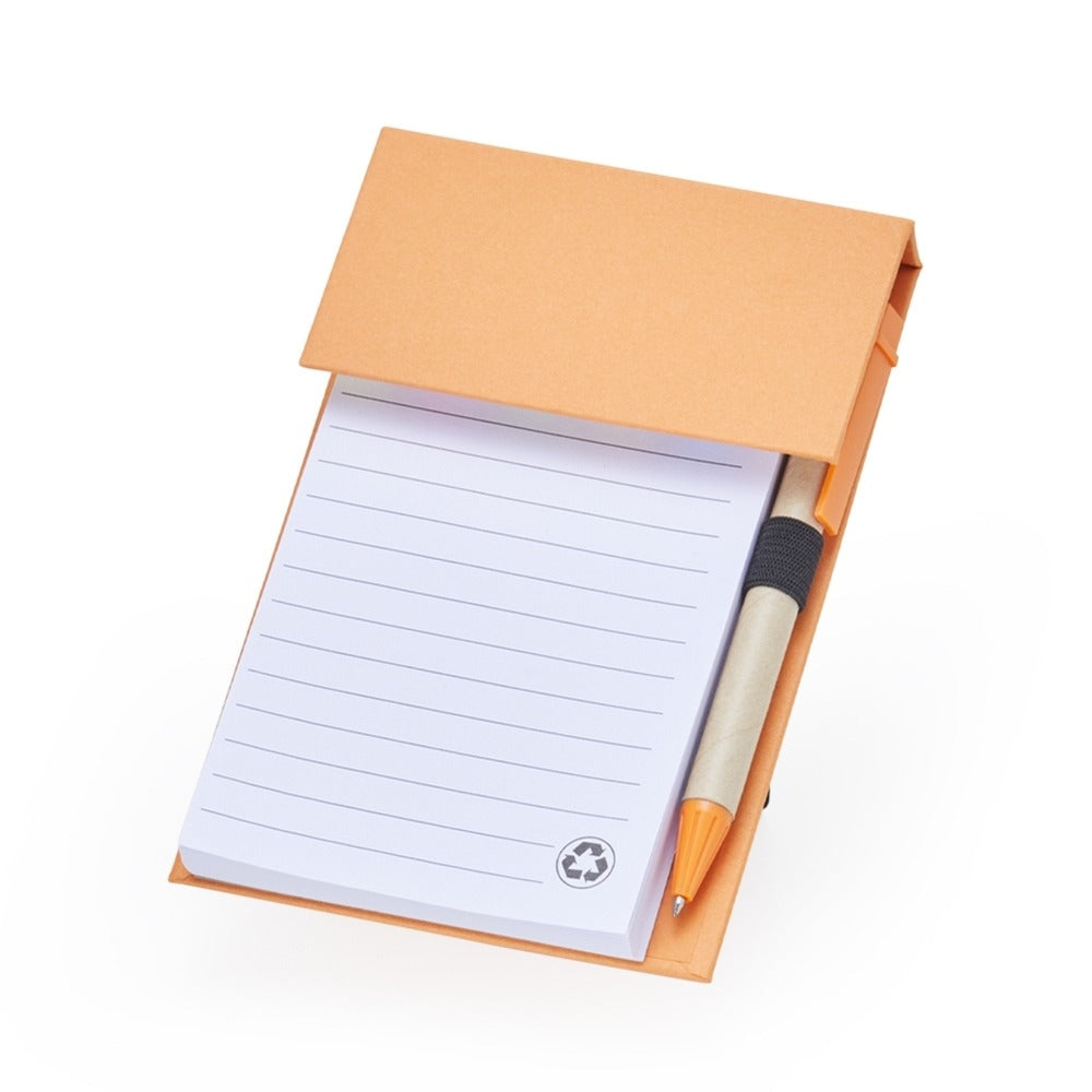 Conversar no WhatsappDescrição: Bloco de anotações ecológico com caneta, feito em kraft com 6 blocos autoadesivos coloridos com aproximadamente 20 folhas e bloco com aproximadamente 100 folhas brancas com pauta. Possui porta caneta elástico e acompanha caneta de papelão e detalhes plásticos, carga esferográfica azul 1.0mm e acionamento por clique.