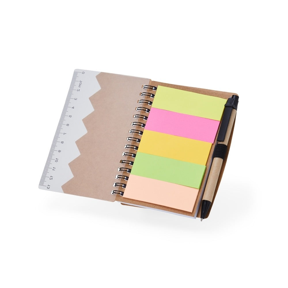 Conversar no WhatsappDescrição: Bloco de anotações ecológico com autoadesivos, régua e caneta, feito em kraft. Contém folha com régua 13 cm, cinco autoadesivos com aproximadamente 13 folhas, bloco com aproximadamente 69 folhas brancas com pauta, porta caneta elástico e acompanha caneta de papelão com detalhes plásticos, carga esferográfica azul 1.0mm e acionamento por clique.