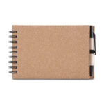 Conversar no WhatsappDescrição: Bloco de notas com capa dura em papelão encadernação em Wire-O e elástico porta-canetas. Possui aproximadamente 70 folhas sem pauta e acompanha caneta com corpo em papelão, acionamento por clique, ponteira e clipe em plástico, além de carga esferográfica azul de 1,0 mm.
