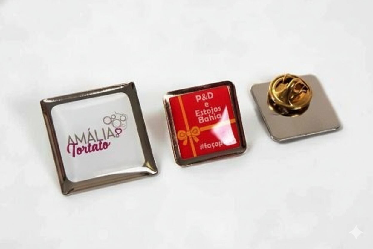 Conversar no WhatsappDescrição: Fundo metálico, niquelado ou dourado, com etiqueta personalizada em gravação digital e acabamento em resina, sendo verso com pino e prendedor em silicone ou em metal.