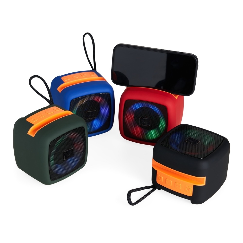 Conversar no WhatsappDescrição: Caixa de som multimídia em plástico com espaço superior para encaixe do celular e base com revestimento antiderrapante. Oferece conectividade Bluetooth e entrada auxiliar P2, além de cartão TF (microSD) e USB-C, permitindo a reprodução de arquivos MP3. Acompanha cordão de nylon e cabo USB-C para carregamento.