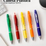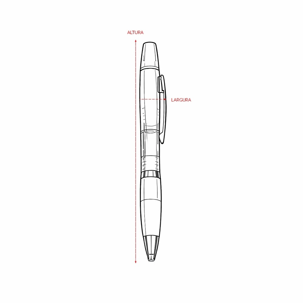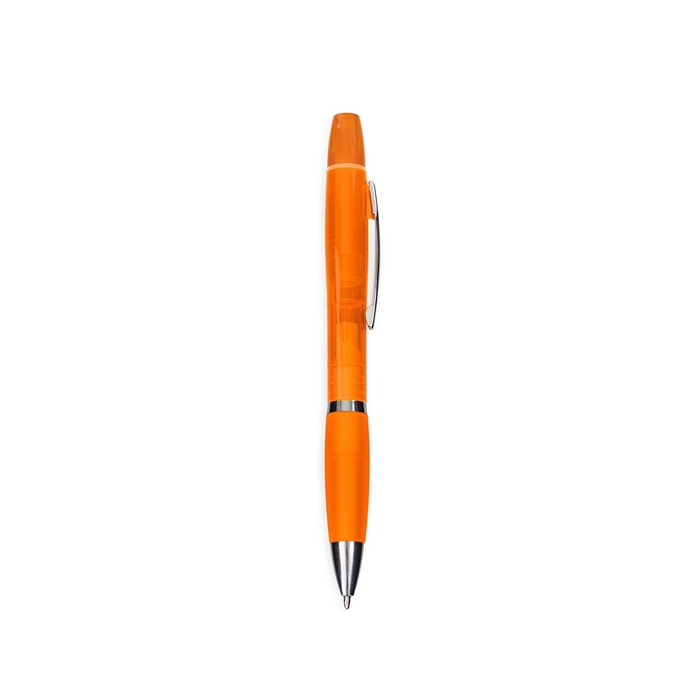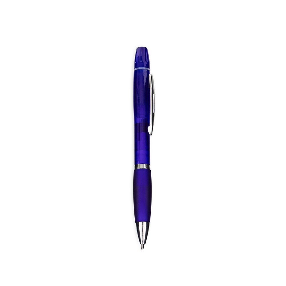 Conversar no WhatsappDescrição: Caneta plástica com marca-texto e tampa protetora localizados no topo. Possui clip e ponteira em metal, acionamento por rotação e ponta esferográfica azul de 1.0mm.