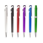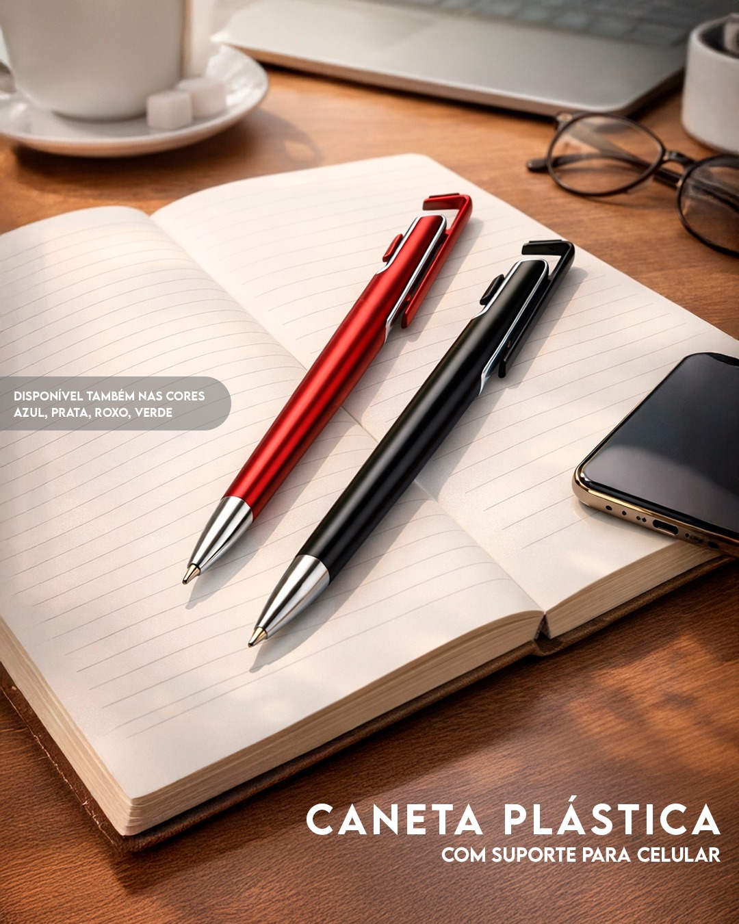 Conversar no WhatsappDescrição: Caneta plástica com ponta metálica, acionamento por clique e abertura que funciona como suporte de celular. Possui ponteira com revestimento em feltro para limpeza de telas e carga esferográfica azul de 1.0mm.