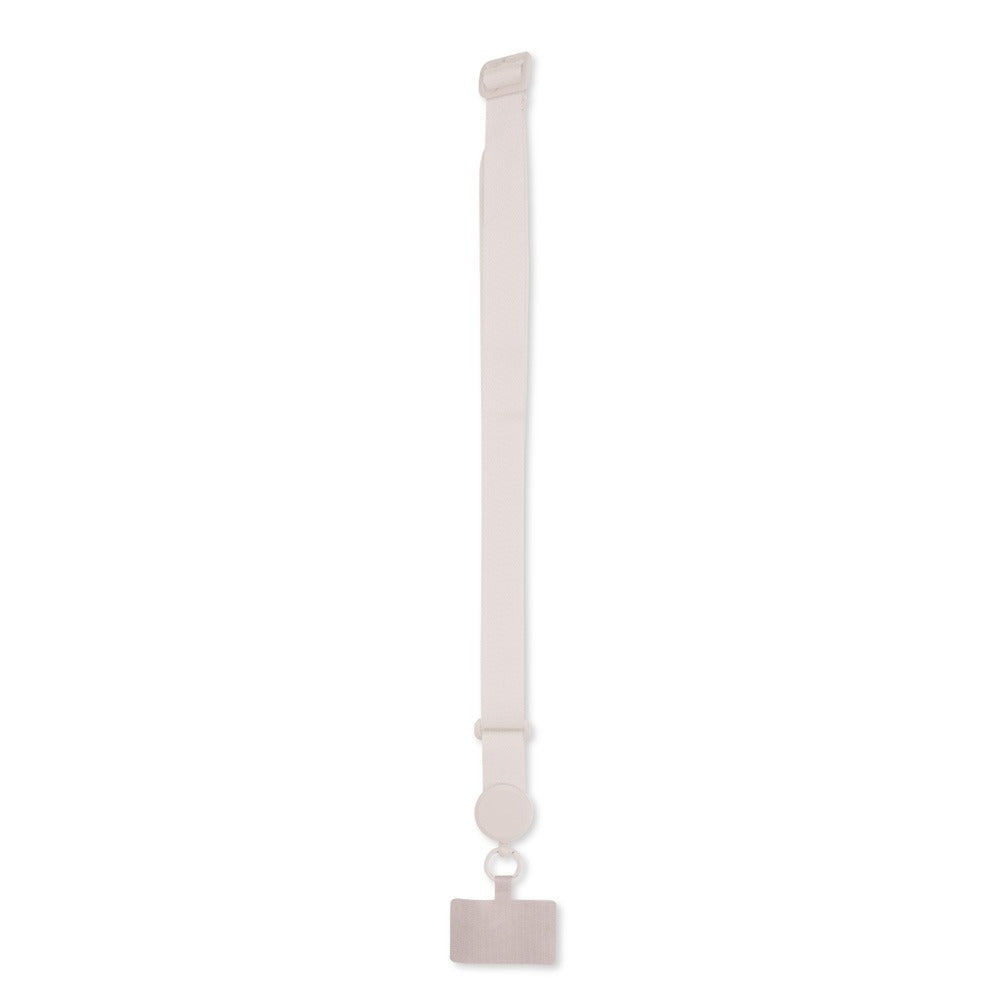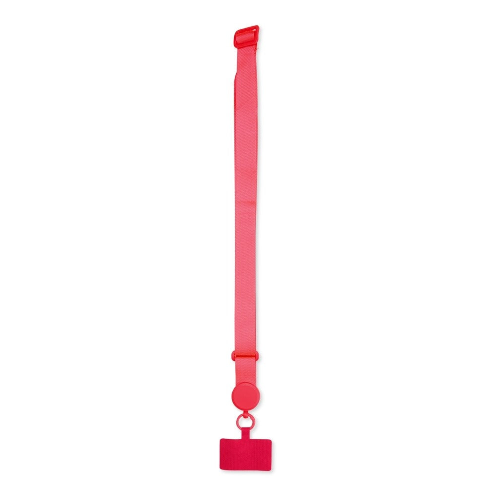 Conversar no WhatsappDescrição: Cordão com alça ajustável para celular feito em poliéster. O acessório é fixado a um cartão retangular que se encaixa na parte interna da capa do celular, próximo à entrada de carregamento USB.