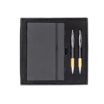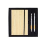 Conversar no WhatsappDescrição: Kit executivo com três peças, composto por uma caderneta, uma caneta e uma lapiseira. A caderneta possui capa dura em papelão reforçado, fechamento em elástico, cerca de 82 folhas pautadas, bloco de folhas amarelas e outro com marcadores autoadesivos coloridos. A caneta e a lapiseira contam com corpo em plástico e detalhes em bambu. Além disso, a caneta possui carga esferográfica azul de 1,0 mm, enquanto a lapiseira dispõe de grafite de 0,7 mm. Acompanha caixa em papelão com berço em plástico para guardar os itens do conjunto.