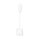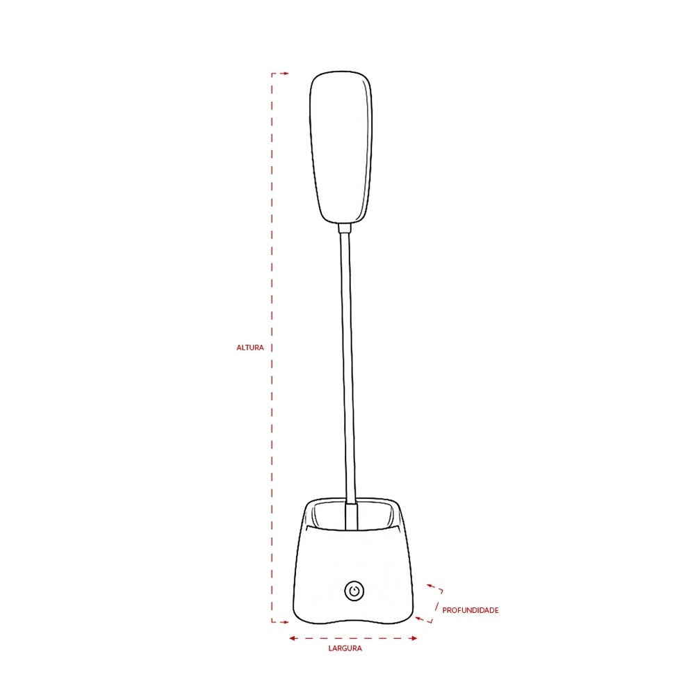 Descrição: Luminária recarregável com 18 LEDs, estrutura em plástico e haste articulável em múltiplos ângulos. Possui base com porta-canetas e acionamento por toque para a seleção de três níveis diferentes de iluminação. Acompanha cabo Micro USB para recarga.