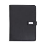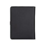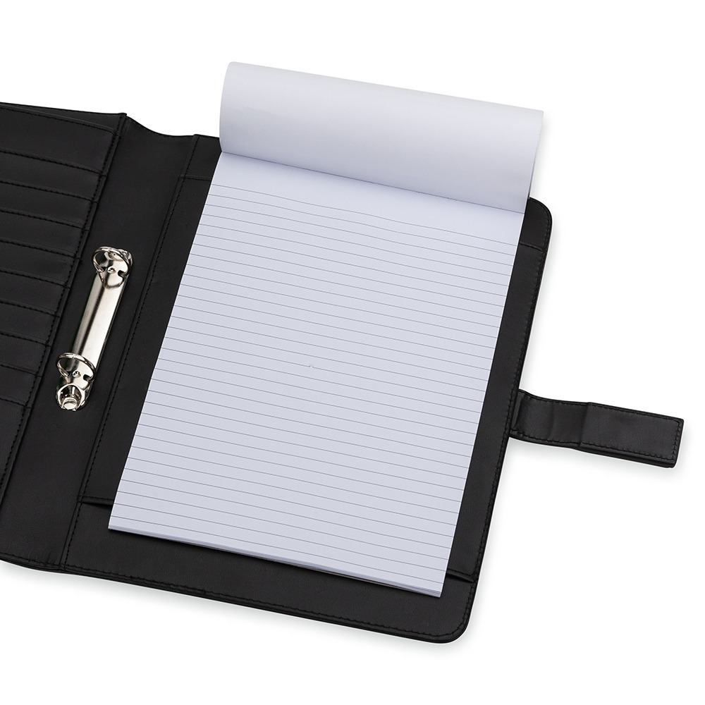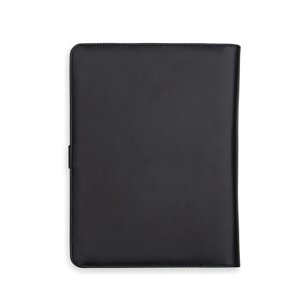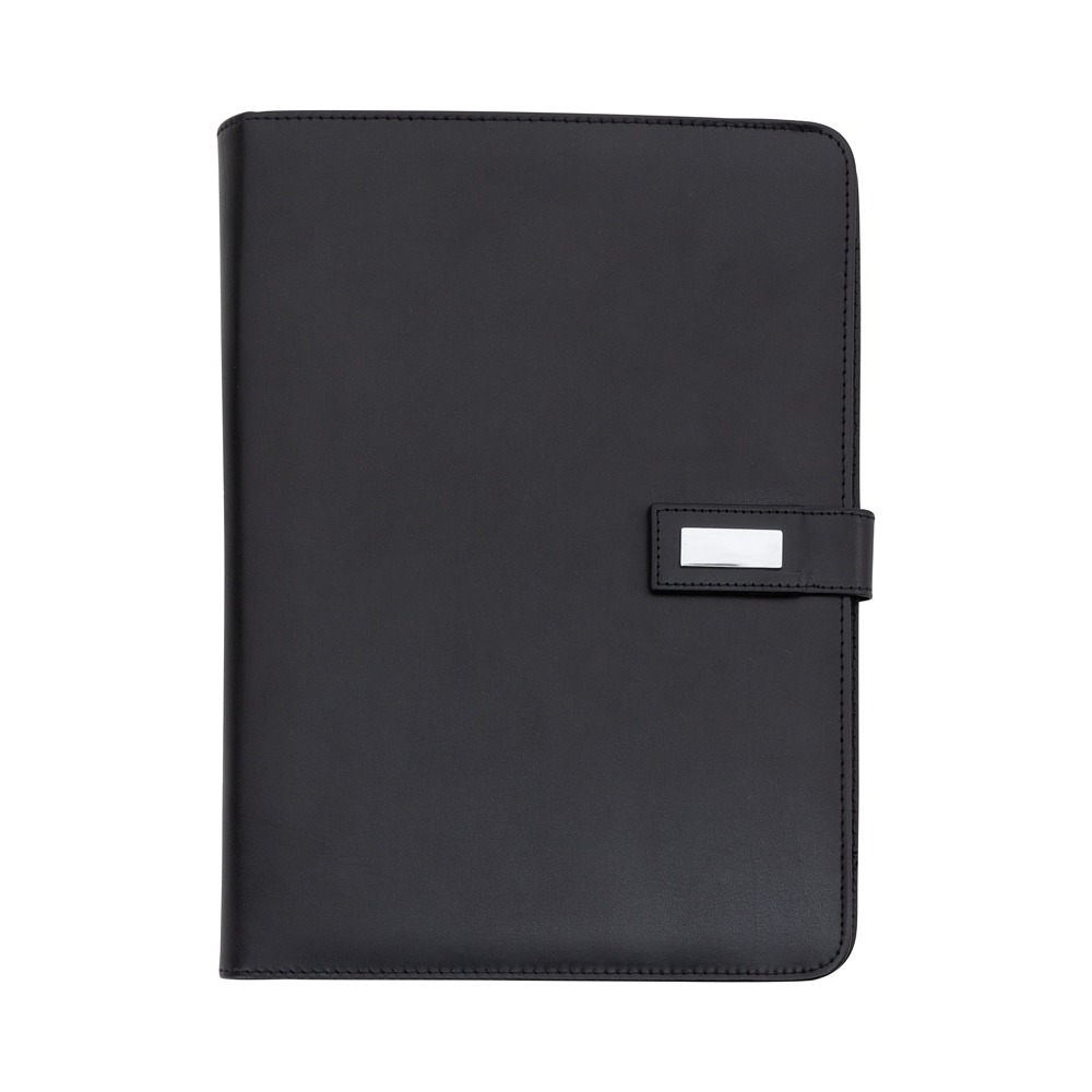 Descrição: Pasta convenção com fecho imantado e plaquinha personalizável. Produzido em couro sintético, a pasta contém bolso lateral na contracapa e bolso com fechamento em zíper, além divisórias para cartões e/ou documentos com bolso lateral. Possui acesso para fichário de duas argolas e compartimento para bloco de folhas com aproximadamente 20 folhas brancas com pauta.