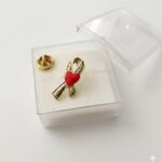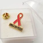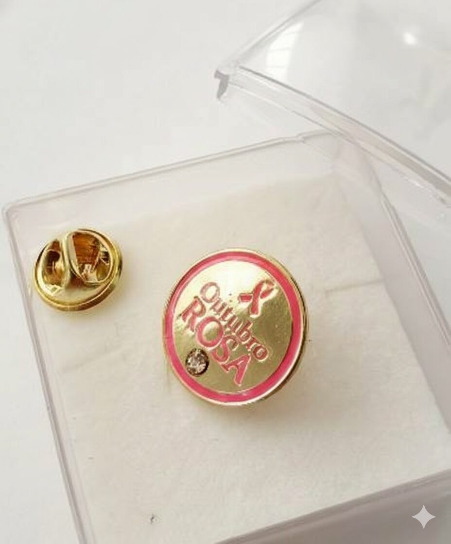 Descrição: Pino de metal, niquelado ou dourado, gravado em relevo com acabamento esmaltado, verso com pino e prendedor de metal.